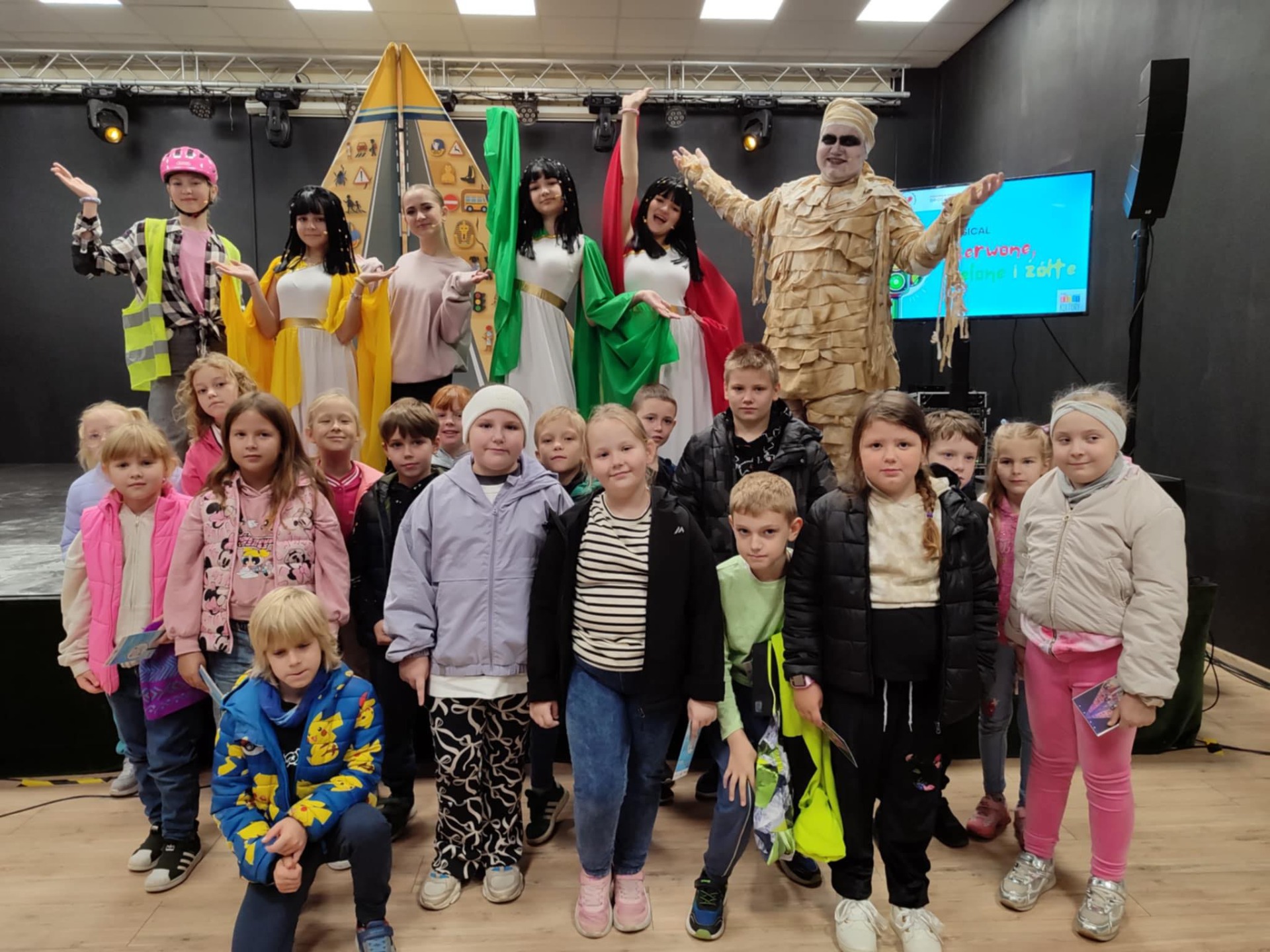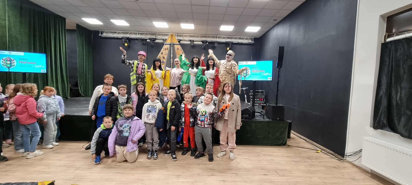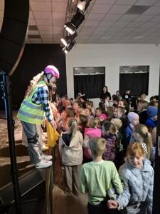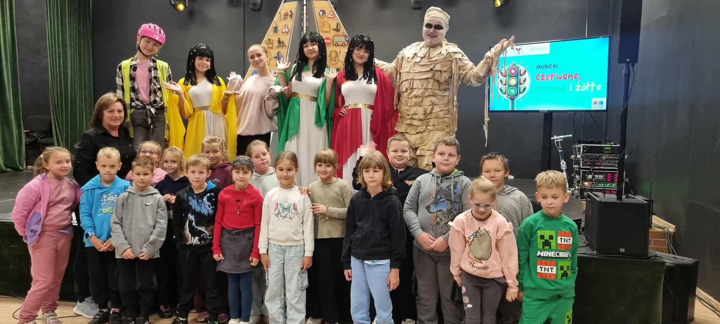 Uczniowie klas I–III wybrali się dziś do Okoneckiego Centrum Kultury w Okonku na musical „Czerwone, żółte, zielone”, poświęcony zasadom bezpieczeństwa. Podczas przedstawienia dzieci w przystępny i zabawny sposób dowiedziały się, jak należy zachowywać się na drodze, w szkole i w codziennych sytuacjach. Kolorowe piosenki i ciekawa fabuła sprawiły, że nauka o bezpieczeństwie stała się dla najmłodszych prawdziwą przygodą. To spotkanie było nie tylko okazją do świetnej zabawy, ale także do utrwalenia ważnych i potrzebnych umiejętności. Widowisko przygotowała Fundacja Barwy Kultury wraz ze Studiem Piosenki Estradowej HIT z Konina, prowadzonym przez Mariusza Urbaniaka.