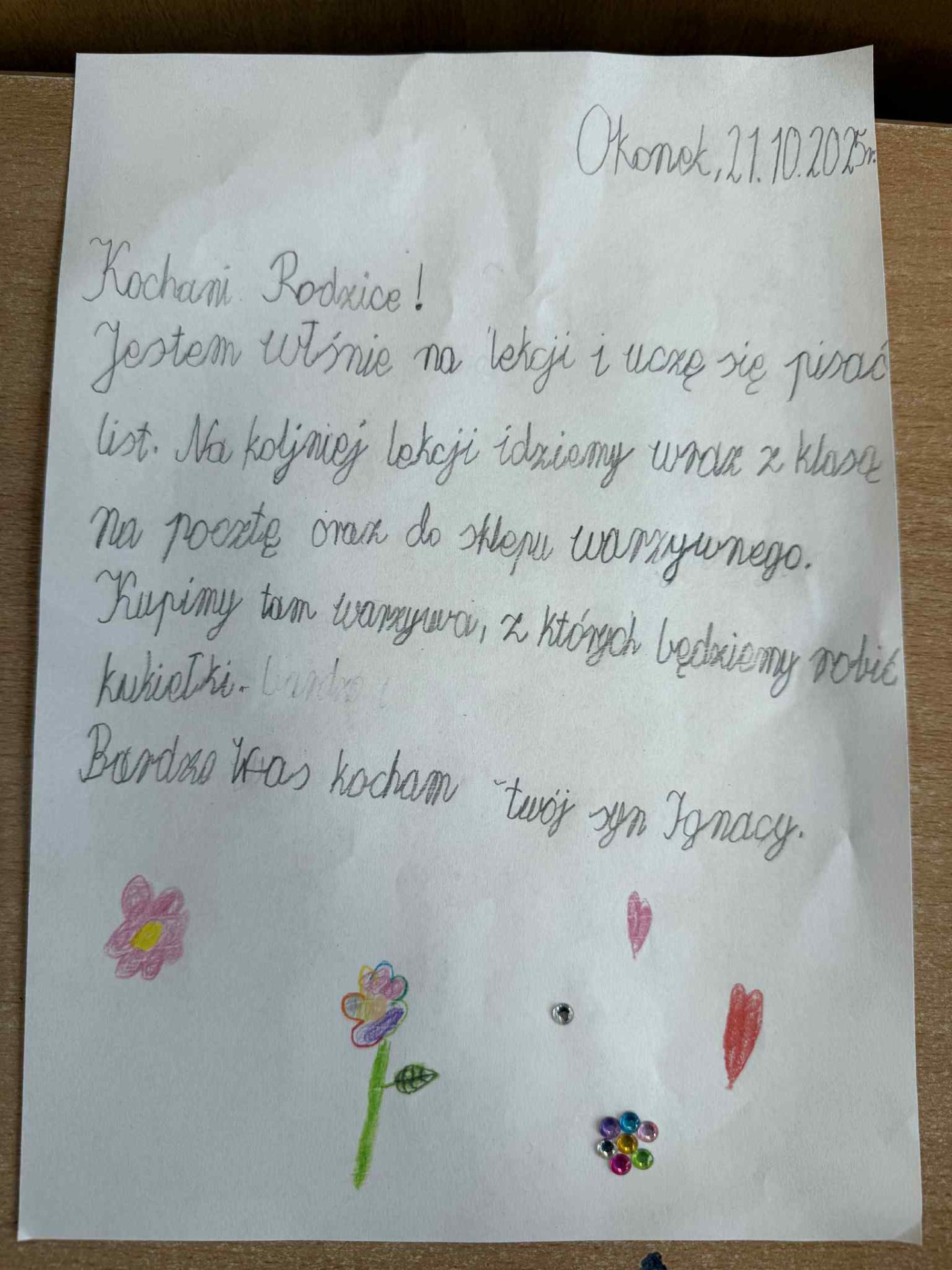 Uczniowie klasy 2a poznawali dziś tajniki pisania listu – uczyli się, jak poprawnie sformułować treść, zaadresować kopertę i przygotować przesyłkę do wysłania. Gdy wszystko było gotowe, ruszyli na pocztę, by samodzielnie kupić znaczek, przykleić go i wysłać swoje listy.
