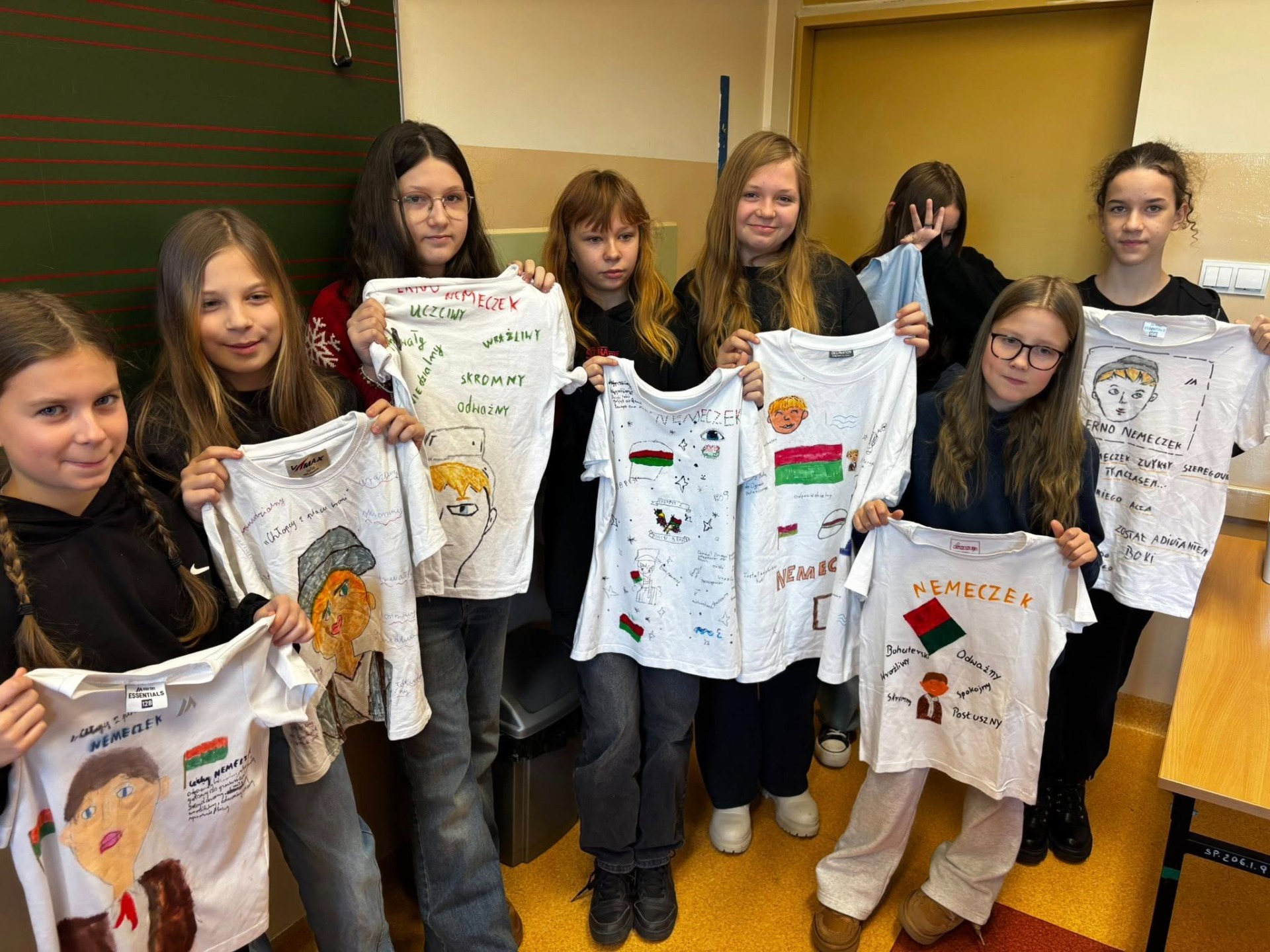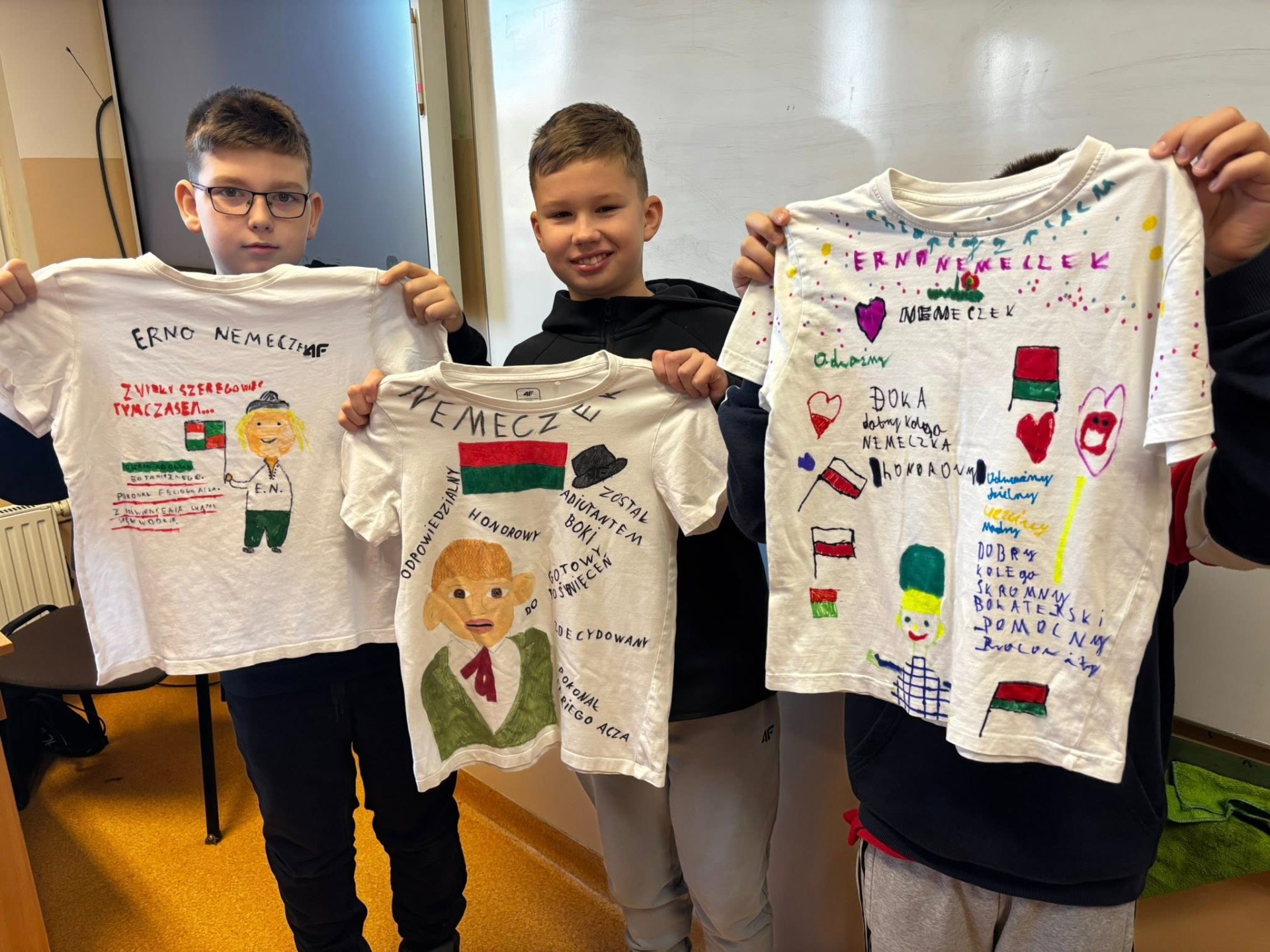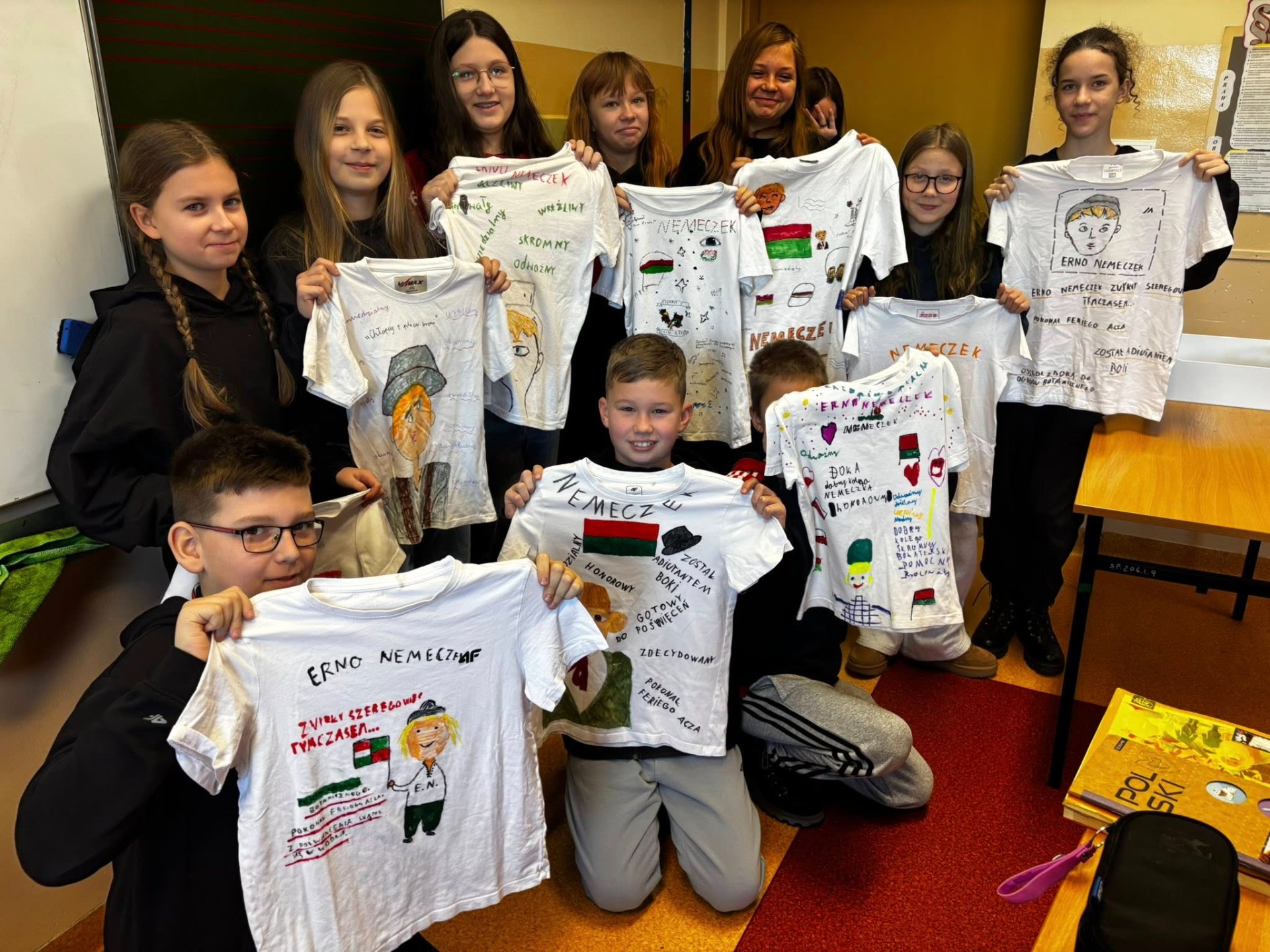 Na podsumowanie naszej czytelniczej przygody uczniowie zmierzyli się z wyjątkowym zadaniem – zaprojektowali koszulki inspirowane postacią Ernesta Nemeczka. W każdym projekcie znalazły się zarówno cechy charakteru bohatera, jak i wybrany cytat ukazujący jego odwagę oraz wrażliwość.