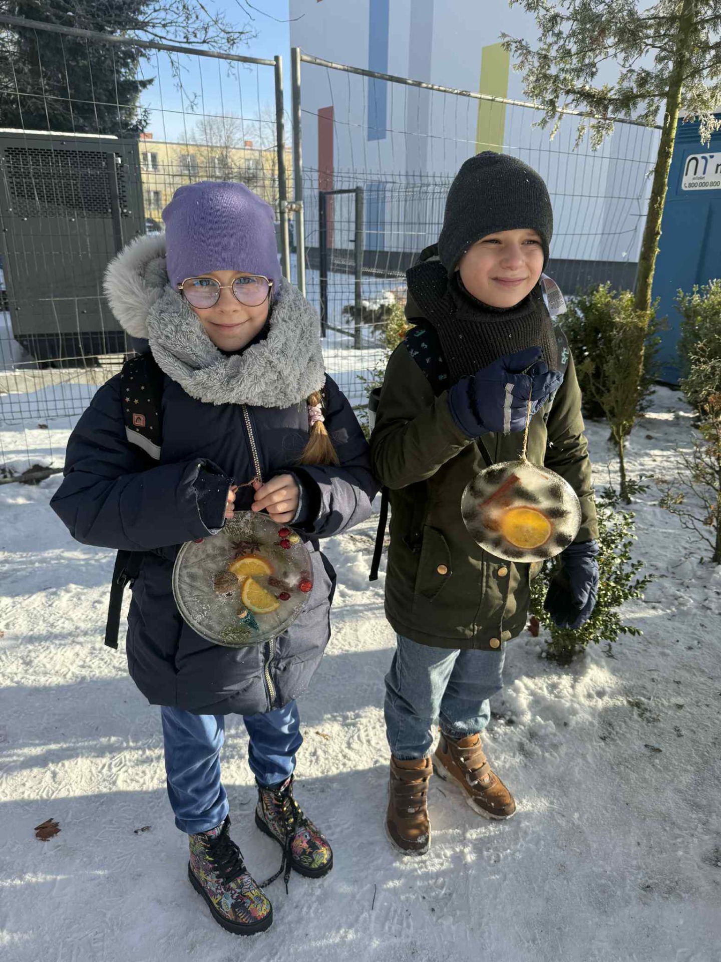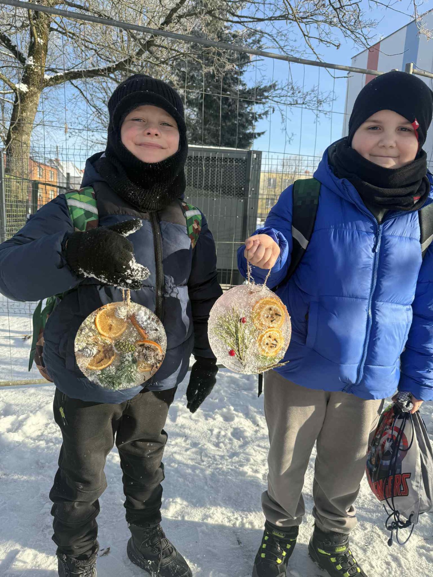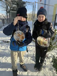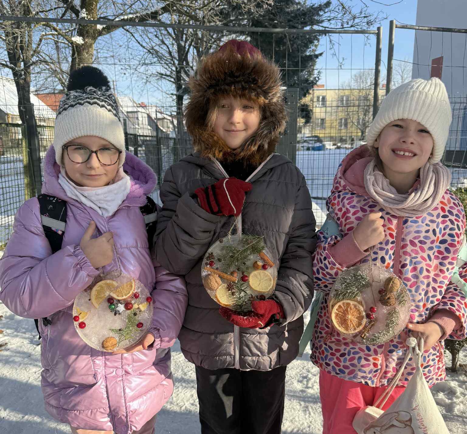 Korzystając z mroźnej pogody, uczniowie klasy 2a podczas zajęć technicznych wykonali lodowe witraże. Te wyjątkowe prace będą teraz zdobiły domowe ogródki oraz balkony uczniów.